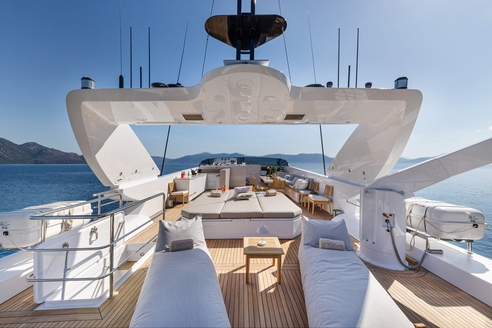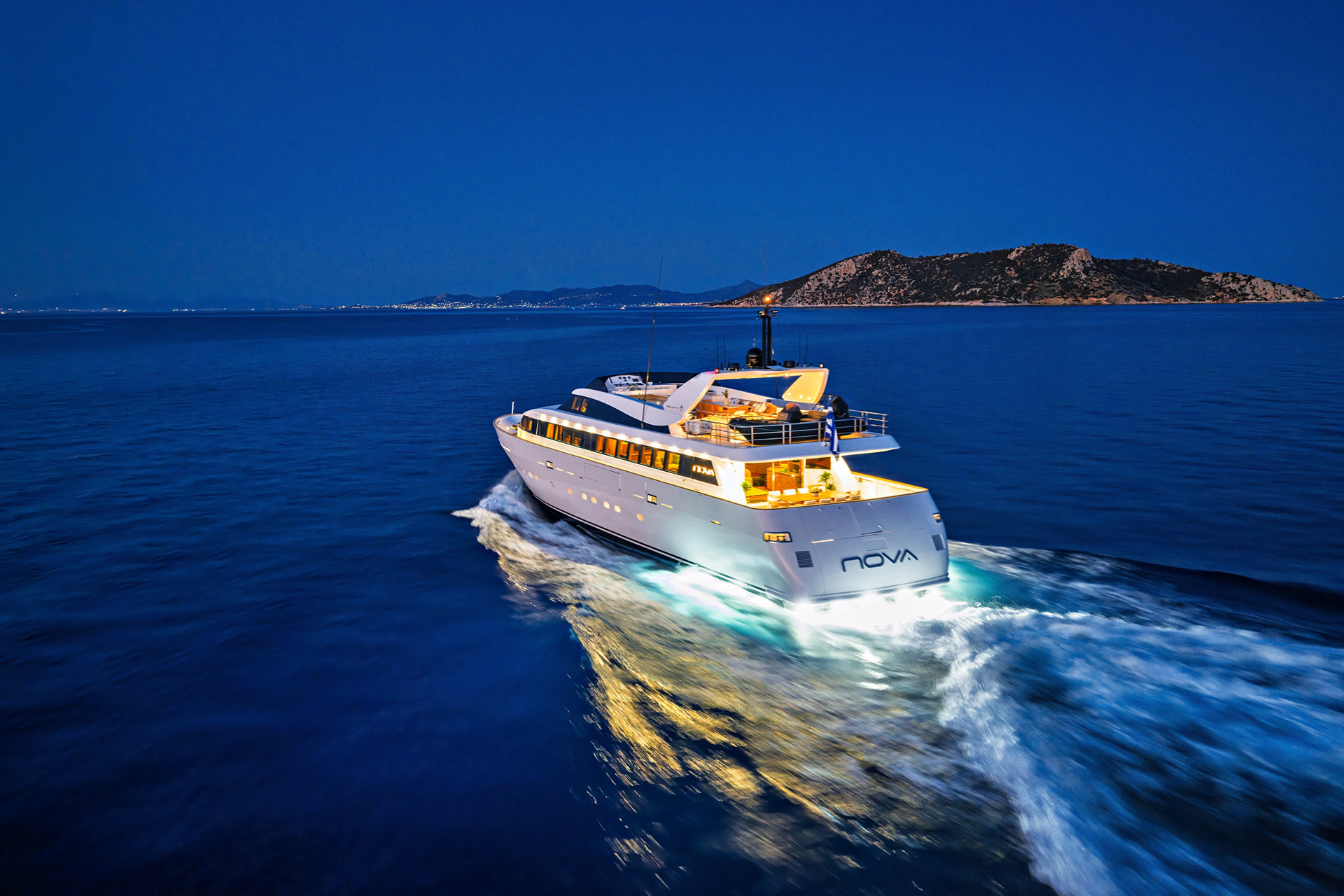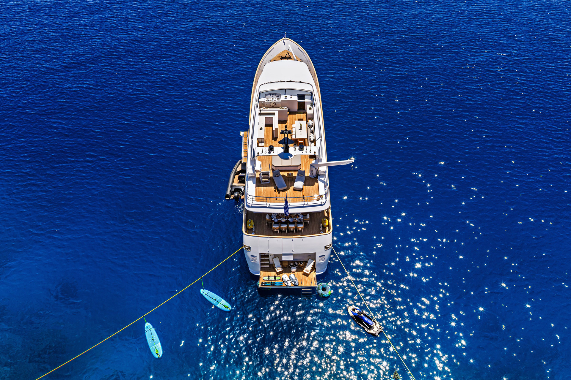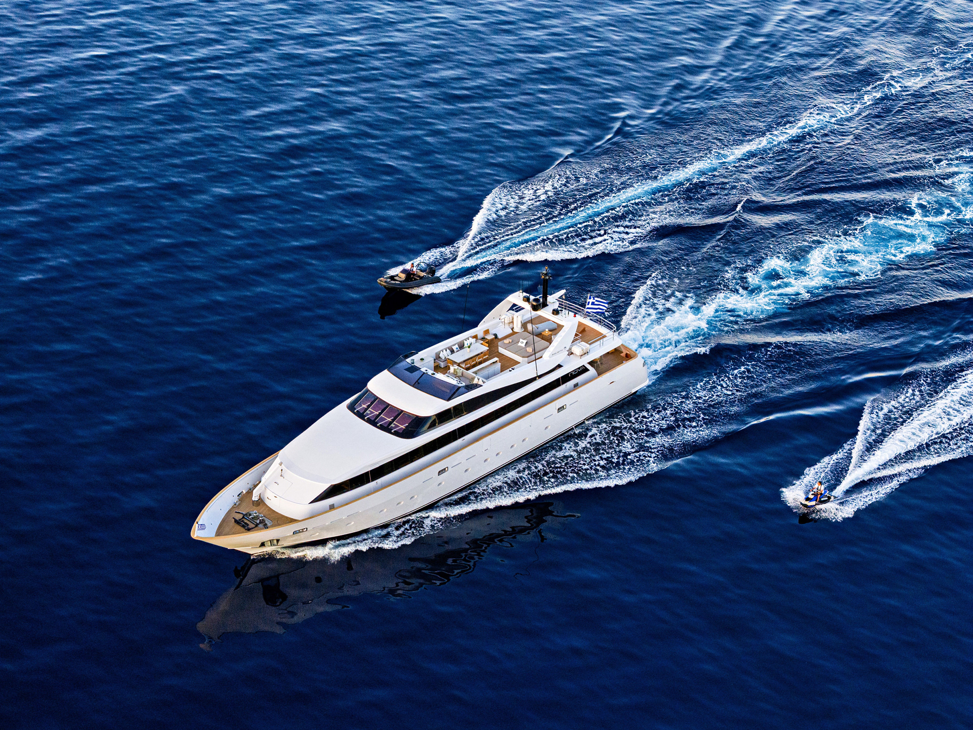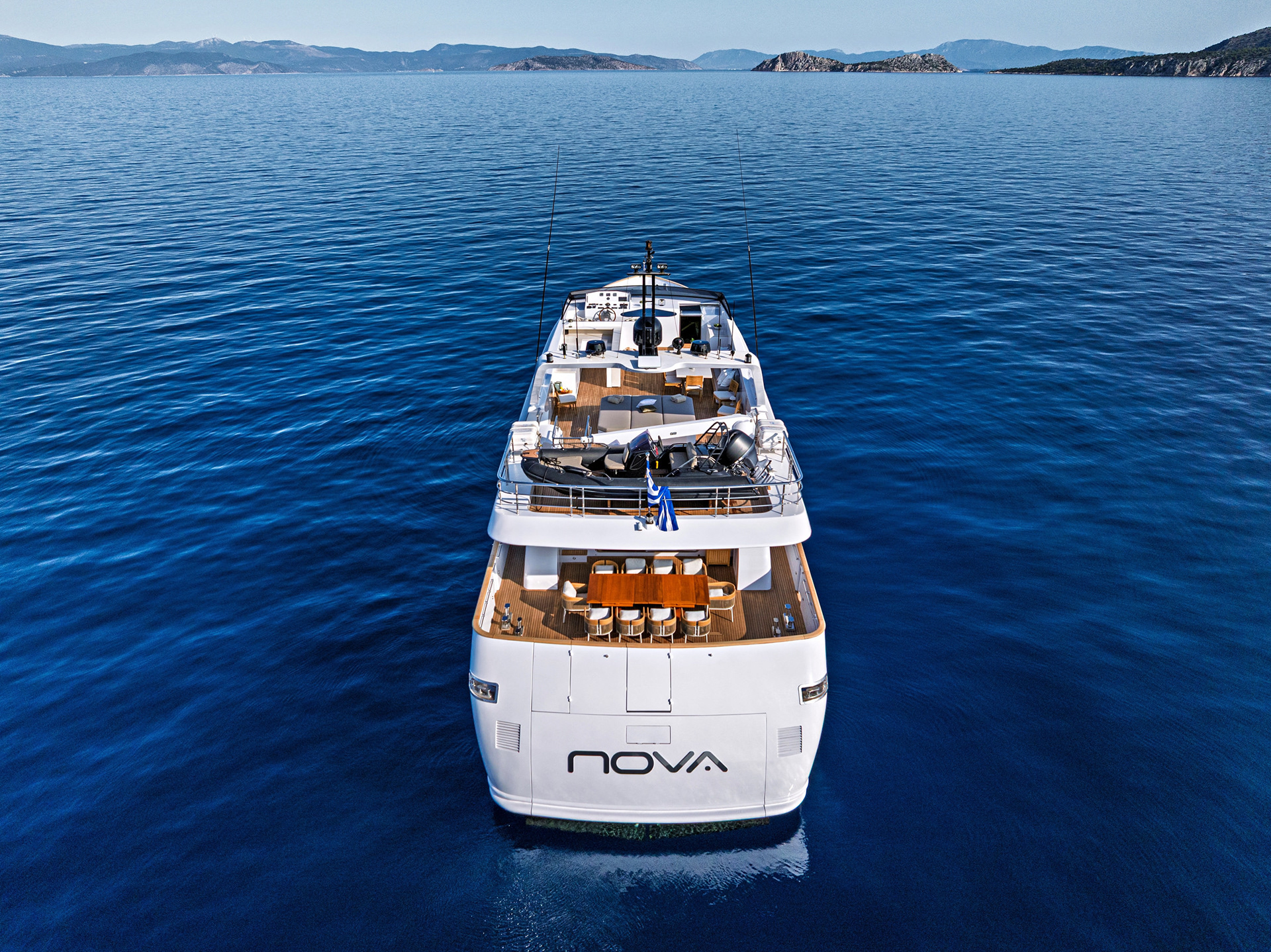 The Nova is a serious charter yacht, accommodating 12 guests with a dedicated crew of seven. Capturing her at 20 knots showed off her performance, but we also made sure to document the "lifestyle" side—the expansive deck spaces and the impressive collection of water toys that make a Greek charter experience unforgettable.
