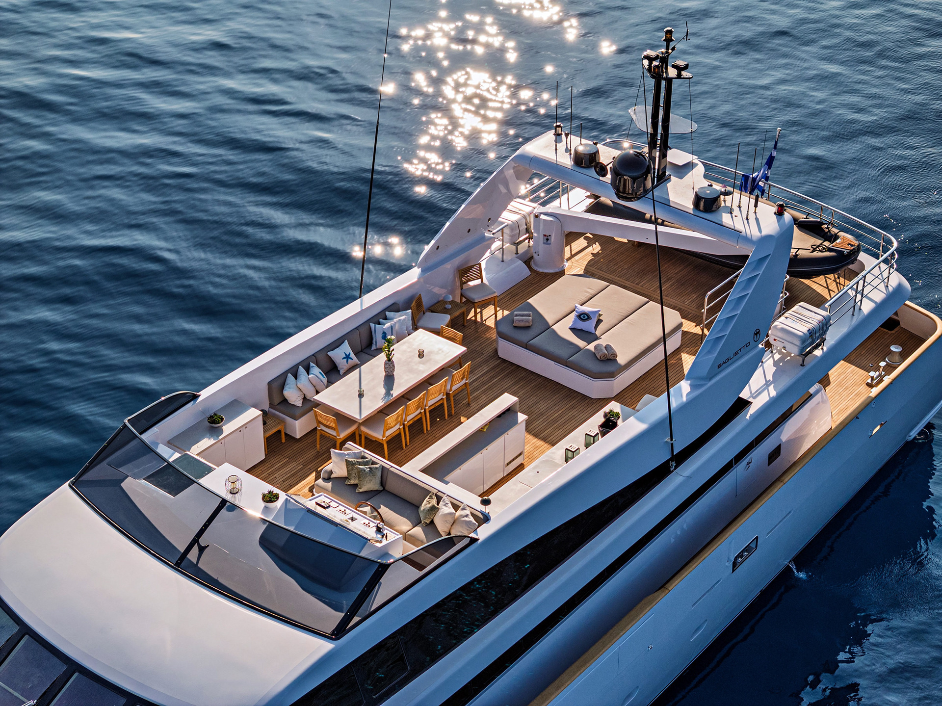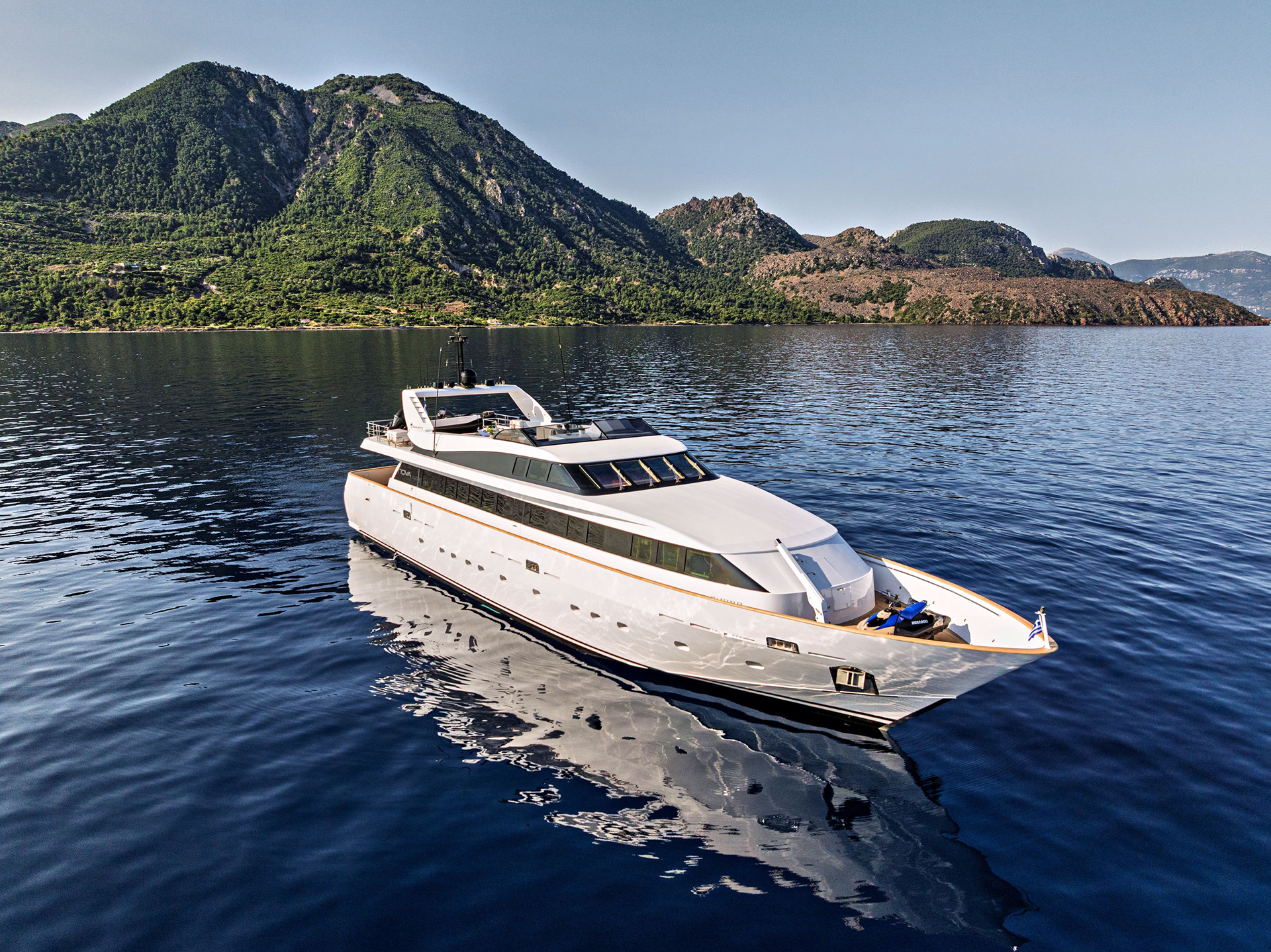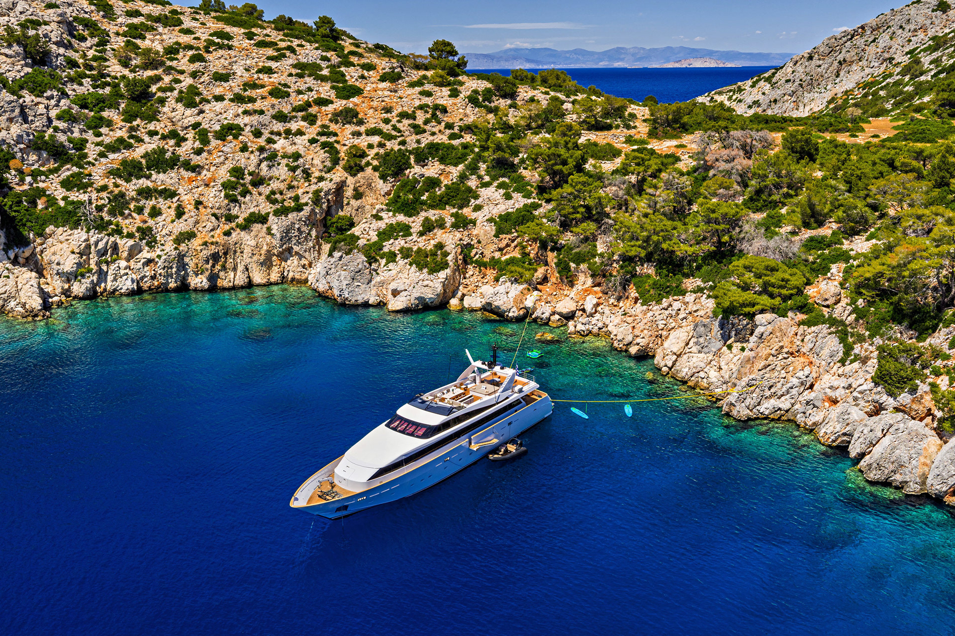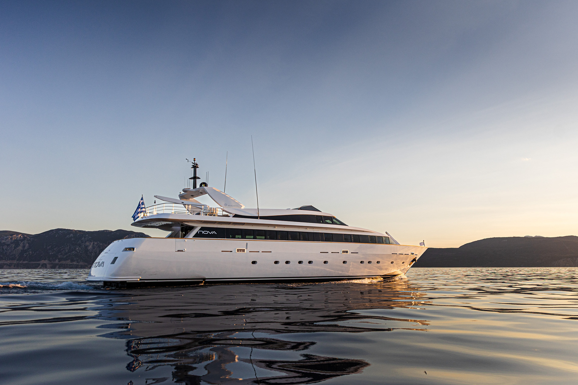 The Nova is a serious charter yacht, accommodating 12 guests with a dedicated crew of seven. Capturing her at 20 knots showed off her performance, but we also made sure to document the "lifestyle" side—the expansive deck spaces and the impressive collection of water toys that make a Greek charter experience unforgettable.