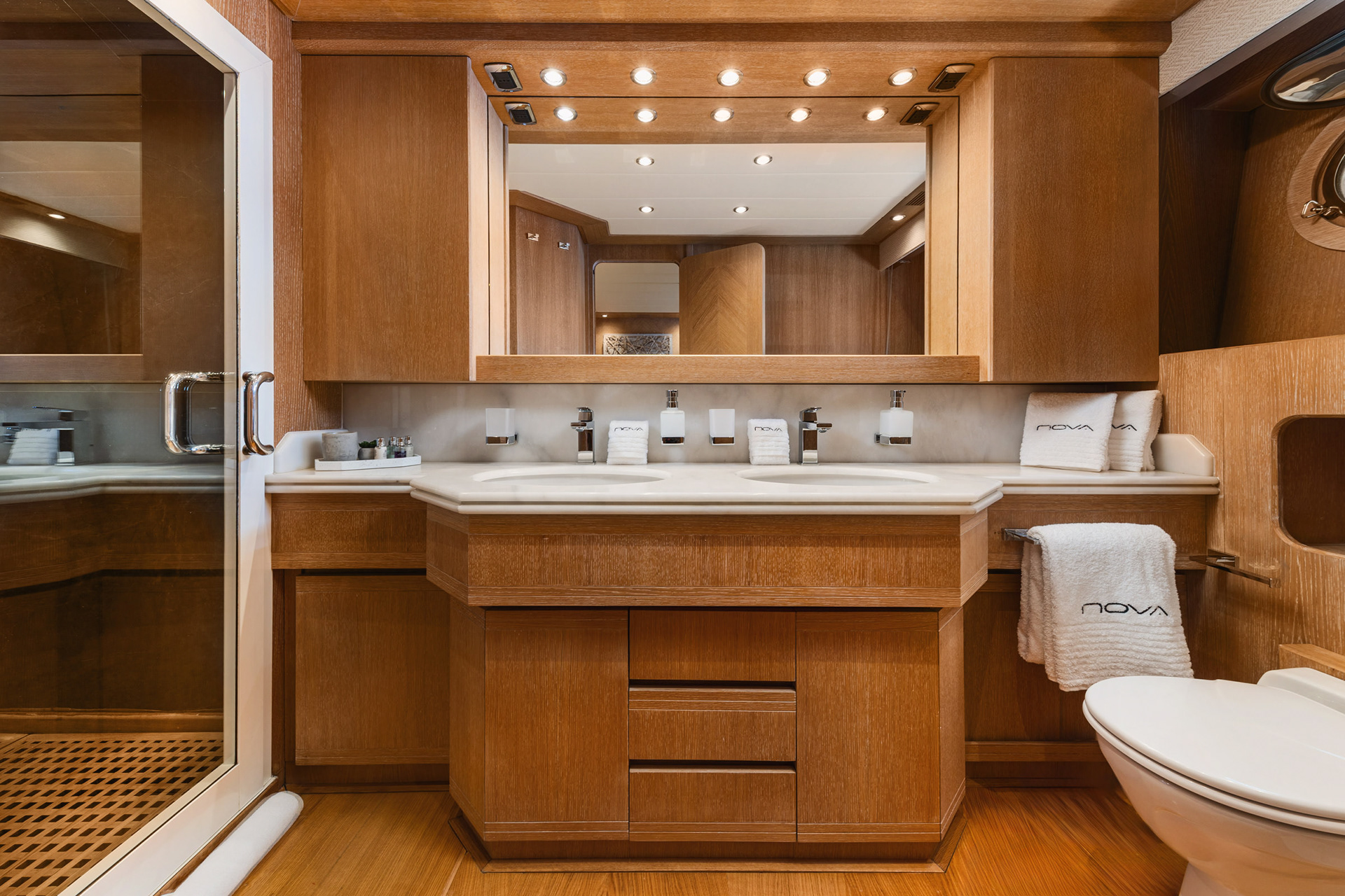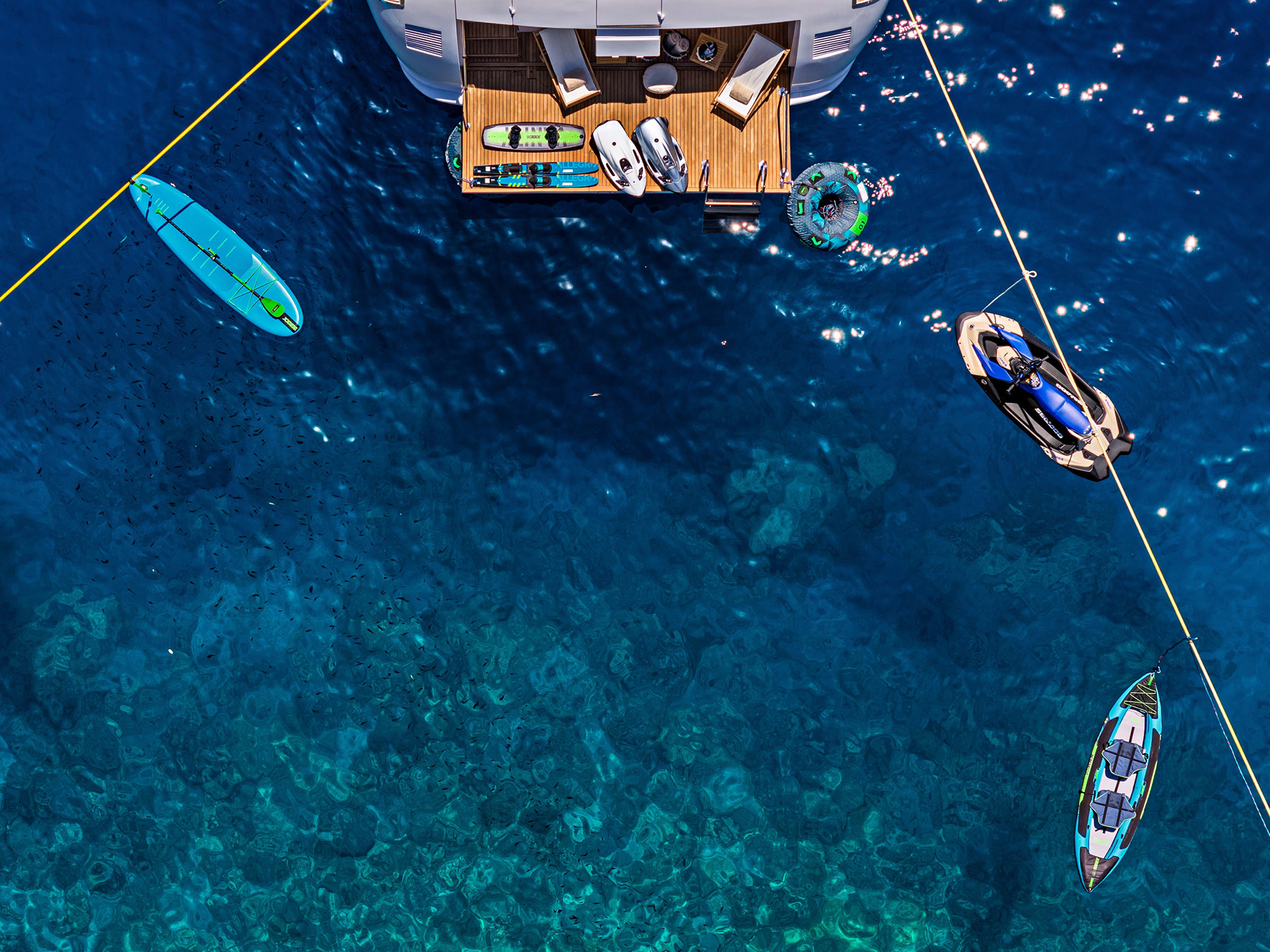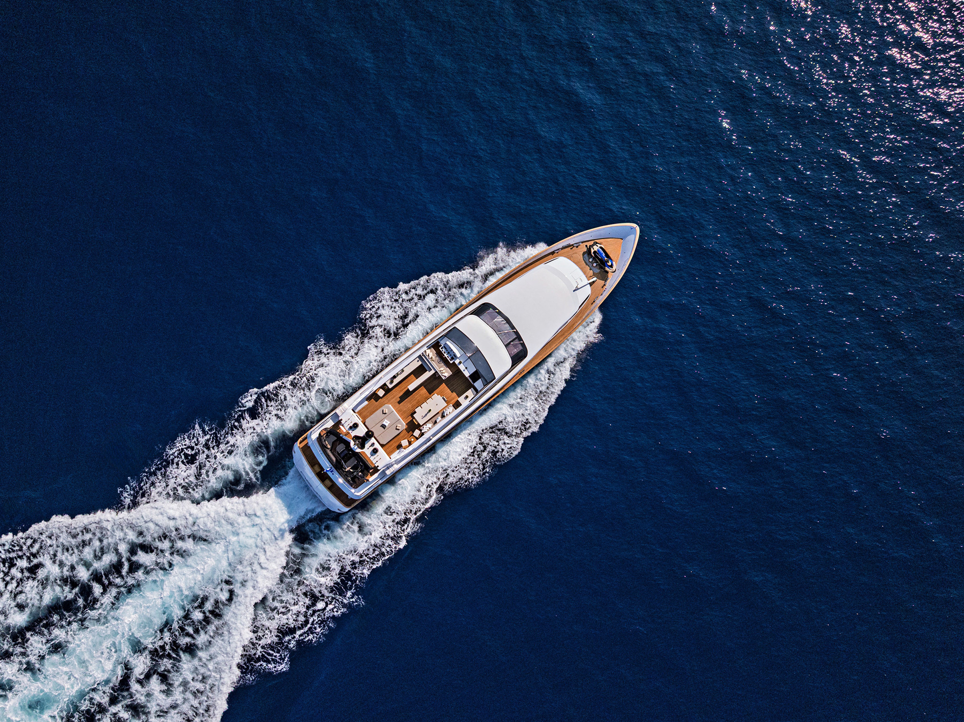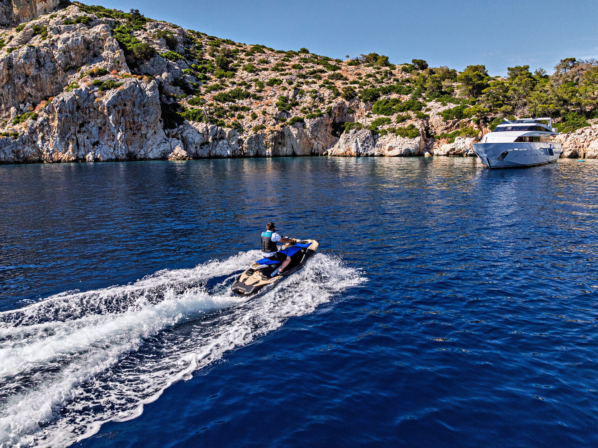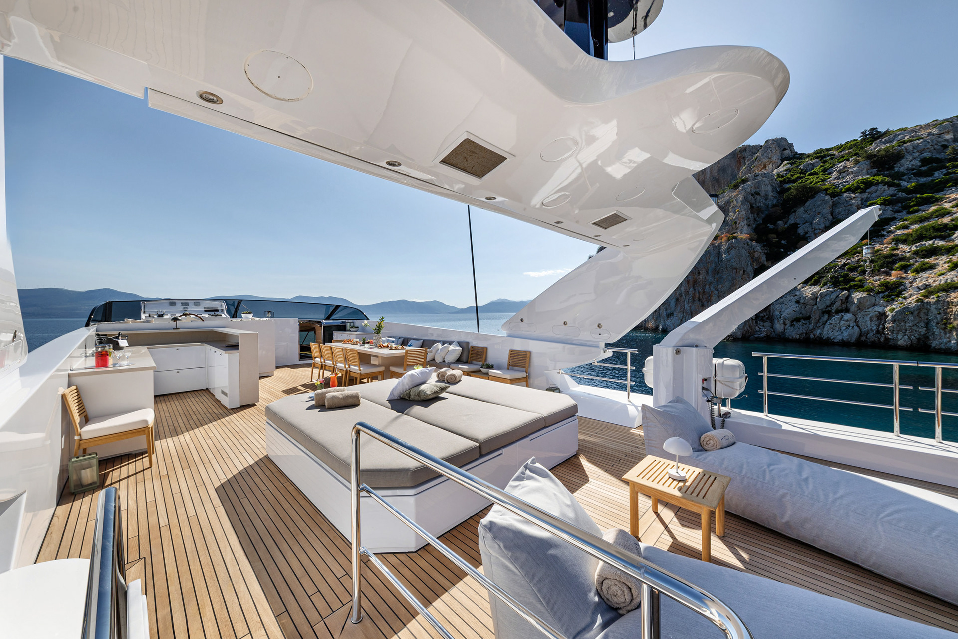 The Nova is a serious charter yacht, accommodating 12 guests with a dedicated crew of seven. Capturing her at 20 knots showed off her performance, but we also made sure to document the "lifestyle" side—the expansive deck spaces and the impressive collection of water toys that make a Greek charter experience unforgettable.
